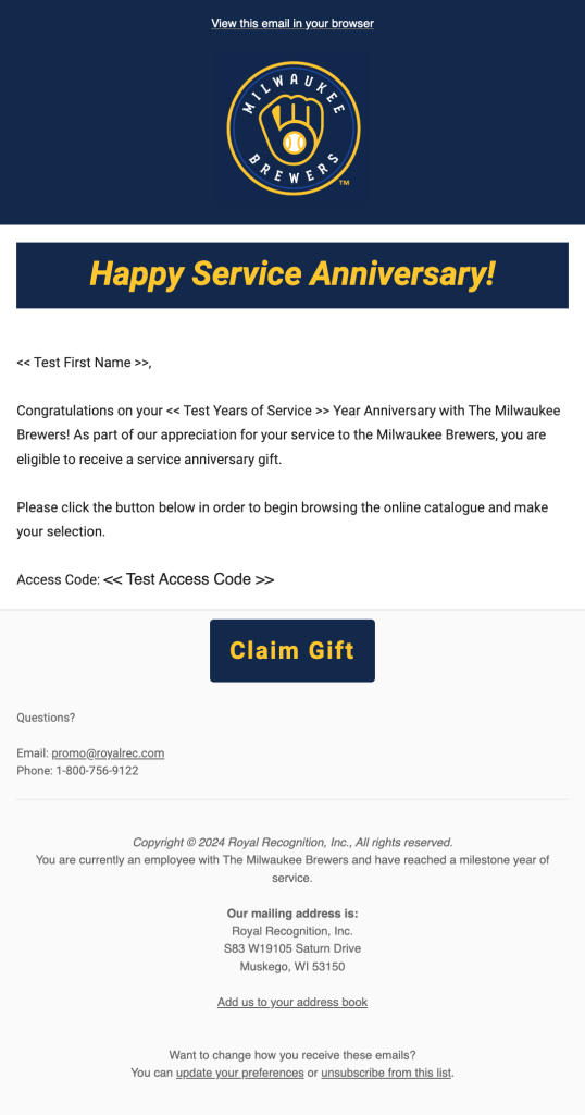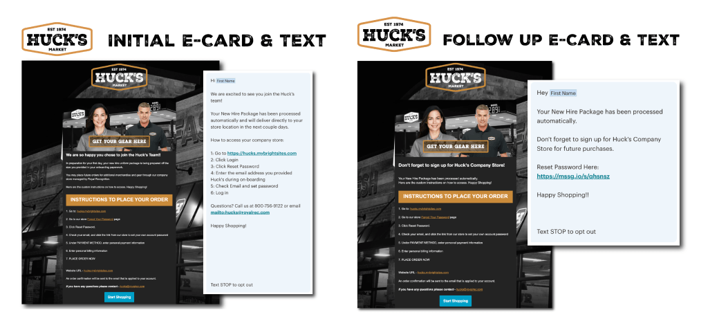 Huck’s is a convenience store with over 2,500 employees at more than 125 locations. This is an Email/SMS campaign I set up for all of their new hires.